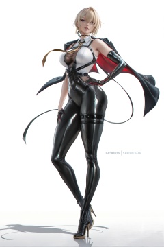 8k,best quality,masterpiece,(ultra-detailed),(high detailed skin),masterpiece,best quality,artist:zd_1995,artist:OlchaS,artist:sakimichan,sakimichan \(style\),jijia,2d,ambient light,full body,full shot,standing,looking at viewer,(solo:1.2),simple background,(white background:1.2),hand on own hip,(white background:1.1),<lora:Evelyn-ill-Tanger-000014:0.8>,Evelyn \(zenless zone zero\),clothes: def Evelyn clothes,Evelyn jacket,1girl,gloves,blonde hair,necktie,short hair,black pants,black footwear,