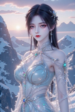 Close-up shot of a young girl standing at the summit of a majestic mountain, her slender figure encased in a delicate dress crafted from gleaming ice. The pre-dawn sky behind her is a kaleidoscope of pinks and oranges, with the sun slowly rising above the horizon. The girl's gaze is fixed on the breathtaking vista, her expression serene as she basks in the glory of the new day.