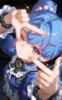 8k,best quality,masterpiece,(ultra-detailed),(high detailed skin),((artist:reoen),(artist:fuzichoco),(artist:atdan),(artist:torino_aqua),year 2024:0.8),[artist:wlop],[artist:ningen_mame],artist:ciloranko,[[artist:rhasta]],artist:tidsean,colorful,<lora:xl-ill-roccia_(wuthering_waves)_v1-000010:0.8>,roccia\(wuthering waves\),1girl,solo,blue hair,twintails,multicolored hair,heterochromia,37_reverse:1999,looking at viewer,finger frame over eye,finger gun,finger_frame,eye focus,hands up,artist:yoneyama mai,artist:ciloranko,artist:sho sho lwlw,from above,from side,perspective,foreshortening,black background,close-up,sparkle,one eye closed,rating:general,best quality,very aesthetic,absurdre,