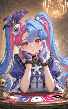 8k,best quality,masterpiece,(ultra-detailed),(high detailed skin),((artist:reoen),(artist:fuzichoco),(artist:atdan),(artist:torino_aqua),year 2024:0.8),[artist:wlop],[artist:ningen_mame],artist:ciloranko,[[artist:rhasta]],artist:tidsean,colorful,<lora:xl-ill-roccia_(wuthering_waves)_v1-000010:0.8>,roccia\(wuthering waves\), 1girl, solo, twintails, blue hair, heterochromia, yellow eyes, pink hair, multicolored hair, card, hair ornament, long hair, red eyes, blush, looking at viewer, heart, dress, playing card, skull hair ornament, gloves, mask, open mouth, bow, upper body, purple gloves, diamond \(shape\), parted bangs, two-tone hair, parted lips