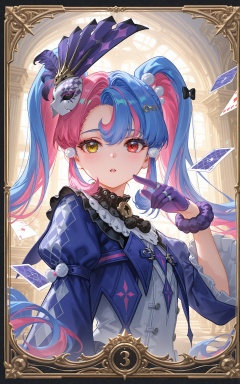 8k,best quality,masterpiece,(ultra-detailed),(high detailed skin),((artist:reoen),(artist:fuzichoco),(artist:atdan),(artist:torino_aqua),year 2024:0.8),[artist:wlop],[artist:ningen_mame],artist:ciloranko,[[artist:rhasta]],artist:tidsean,colorful,<lora:xl-ill-roccia_(wuthering_waves)_v1-000010:0.8>,roccia\(wuthering waves\), 1girl, solo, twintails, blue hair, heterochromia, yellow eyes, pink hair, multicolored hair, card, hair ornament, long hair, red eyes, blush, looking at viewer, heart, dress, playing card, skull hair ornament, gloves, mask, open mouth, bow, upper body, purple gloves, diamond \(shape\), parted bangs, two-tone hair, parted lips