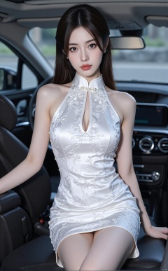 1girl, solo, long hair, breasts, looking at viewer, brown hair, dress, bare shoulders, brown eyes, sitting, sleeveless, white dress, lips, sleeveless dress, chinese clothes, short dress, crossed legs, ground vehicle, china dress, motor vehicle, realistic, car, car interior,cheongsam