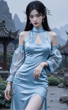 1girl, solo, long hair, breasts, cleavage, looking at viewer, black hair, hair ornament, dress, bare shoulders, jewelry, blue dress,standing, cowboy shot, earrings, parted lips, long sleeve, outdoors, bracelet, lips, chinese clothes, china dress, side slit, realistic,cheongsam