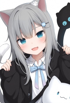 slit_pupils,amashiro_natsuki, CHARACTERS-nachoneko, 1girl, animal_ears, sleeves_past_wrists, cat_tail, tail, shirt, cat_ears, white_shirt, grey_hair, hair_ornament, solo, smile, blue_eyes, fang, jacket, collared_shirt, bow, blue_bow, :d, hands_up, black_jacket, hairclip, cat_girl, hood_down, long_hair, long_sleeves, looking_at_viewer, dress_shirt, hood, white_background, blush, simple_background, upper_body, open_mouth, hair_between_eyes, hooded_jacket, tail_raised, open_jacket, open_clothes, pinching_sleeves, animal_ear_fluff,masterpiece, best quality, newest, highres, absurdres, newest,