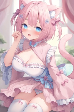 loli,cute,1girl, solo, breasts, looking at viewer, blush, smile, short hair, open mouth, bangs, blue eyes, large breasts, hair ornament, thighhighs, long sleeves, dress, ribbon, animal ears, cleavage, medium breasts, underwear, panties, tail, pink hair, :d, thighs, cowboy shot, frills, japanese clothes, virtual youtuber, cat ears, off shoulder, white panties, white thighhighs, two side up, cat tail,