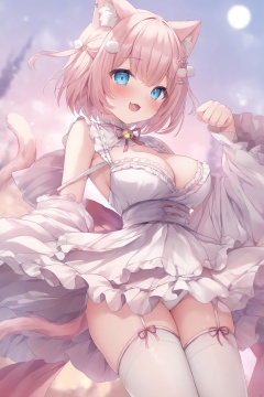 loli,cute,1girl, solo, breasts, looking at viewer, blush, smile, short hair, open mouth, bangs, blue eyes, large breasts, hair ornament, thighhighs, long sleeves, dress, ribbon, animal ears, cleavage, medium breasts, underwear, panties, tail, pink hair, :d, thighs, cowboy shot, frills, japanese clothes, virtual youtuber, cat ears, off shoulder, white panties, white thighhighs, two side up, cat tail,
