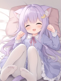 loli,cute,1girl, solo, long hair, blush, smile, open mouth, hair ornament, long sleeves, dress, animal ears, tail, closed eyes, pink hair, purple hair, :d, pantyhose, lying, frills, hairclip, fang, cat ears, on back, feet, cat tail, animal ear fluff, legs, pillow, bed, ^ ^, no shoes, frilled dress, cat girl, crescent, knees up, purple dress, white pantyhose, paw pose, crescent hair ornament, fish hair ornament