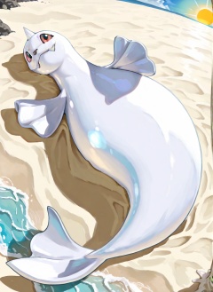 Masterpiece,Best Quality,dewgong,white body,full body,feral,solo,flipper,no humans,pokemon \(creature\),<lora:dewgongPONY:0.8>,sea lion,score_9,score_8_up,score_7_up,score_6_up,on back,looking at sun,temptation,furry,beach,