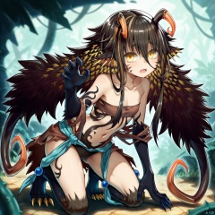 masterpiece, best quality, high quality, Traptrix Holetaea \(ygo\), 1girl, solo, long hair, open mouth, brown hair, black hair, yellow eyes, horns, monster girl, claws,