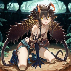 masterpiece, best quality, high quality, Traptrix Holetaea \(ygo\), 1girl, solo, long hair, open mouth, brown hair, black hair, yellow eyes, horns, claws, rolling on the ground,