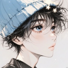 tousled hair and striking blue eyes. The person is wearing a blue hat adorned with white stars. The background is mostly white