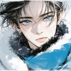 This image is a digital artwork of a person with striking blue eyes. The person is wearing a blue garment