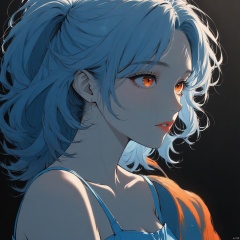 An animated image of a woman with light blue hair. The woman's hair is wavy and cascades in a ponytail. She is wearing a light blue sleeveless dress with a strap over her shoulders. Her eyes are a bright orange color. The background is a solid black.