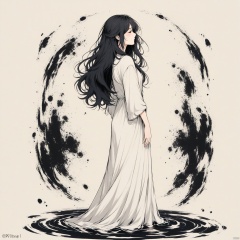 An illustration of a woman in a white dress with long black hair. The woman is facing the left side of the image