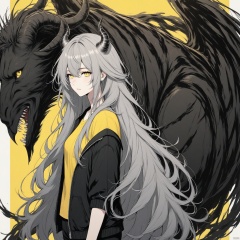 An animated image of a woman with long gray hair and horns on her head. She is wearing a black jacket with a zipper on the front. She has a yellow t-shirt and black pants. Her eyes are yellow and her mouth is slightly open. Her hair is long and cascades over her shoulders. The background is a bright yellow.