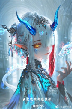 1girl, solo, long hair, looking at viewer, smile, jewelry, closed mouth, yellow eyes, upper body, white hair, red hair, multicolored hair, earrings, horns, pointy ears, hair over one eye, tassel, snake, chinese text ,backlighting,blue and white theme,depth of field,cinematic lighting,light particles,lens flare, (artist:quasarcake:0.8),extreme aesthetic,(wlop:0.6),masterpiece,best quality,good quality,newest,year 2024,year 2023,very aesthetic,absurdres,Visual impact,A shot with tension, ultra-high resolution,32K UHD,sharp focus,best-quality,masterpiece,Emotionalization,unconventional supreme masterpiece,masterful details,temperate atmosphere,with a high-end texture,in the style of fashion photography, (Visual impact:1.2),giving the poster a dynamic and visually striking appearance,impactful picture,offcial art,colorful,splash of color,movie perspective, masterpiece,best quality,amazing quality,very aesthetic,absurdres,best quality,newest,