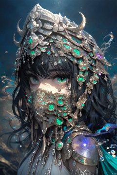 A beautiful woman with wavy black hair and striking green eyes wears an ornate Venetian mask. The mask is intricately designed with gold and silver details, partially covering her face, enhancing her mysterious allure. The background is a dreamy, surreal blend of deep blues, purples, and hints of gold, creating an ethereal atmosphere. The entire composition is rendered in an abstract ink style, with flowing lines and splashes of ink forming the textures and shadows, adding a sense of movement and mystery to the piece.