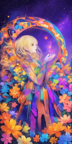 YHCH,It's a vibrant digital painting depicting a humanoid figure whose flowing, translucent, blond hair blends into a sea of colorful flowers. The background was a deep, starry night sky, with flowers in shades of purple, pink and orange,