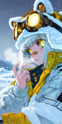 cogecha,(mika pikazo:0.4),[:(onono imoko:0.7),:12](rhasta:0.4),[quasarcake,::12][(jima:0.8),::12] ultra close-up of the maiden glaring defiantly, her platinum white undercut hair with glowing yellow highlights framing her face. Industrial-grade ski goggles are pushed up, revealing her vertical-pupil eyes. Her heated breath is melting the snow on her scarf. One of her tiger teeth, chipped with a gold filling, is visible. A neon orange防寒面罩(cold-weather mask) is pulled down to her chin. A cross-shaped bandaid is across her nose bridge, and holographic snow data is reflected on her goggles. Steam vents on her jacket collar emit heat waves.
