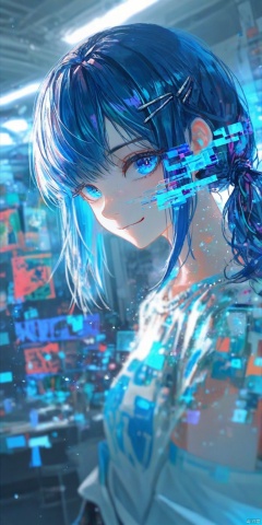 1girl, solo, long hair, looking at viewer, smile, bangs, blue eyes, hair ornament, twintails, blue hair, upper body, hairclip, indoors, glitch ,backlighting,blue and white theme,depth of field,cinematic lighting,light particles,lens flare, (artist:quasarcake:0.8),extreme aesthetic,(wlop:0.6),masterpiece,best quality,good quality,newest,year 2024,year 2023,very aesthetic,absurdres,Visual impact,A shot with tension, ultra-high resolution,32K UHD,sharp focus,best-quality,masterpiece,Emotionalization,unconventional supreme masterpiece,masterful details,temperate atmosphere,with a high-end texture,in the style of fashion photography, (Visual impact:1.2),giving the poster a dynamic and visually striking appearance,impactful picture,offcial art,colorful,splash of color,movie perspective, masterpiece,best quality,amazing quality,very aesthetic,absurdres,best quality,newest