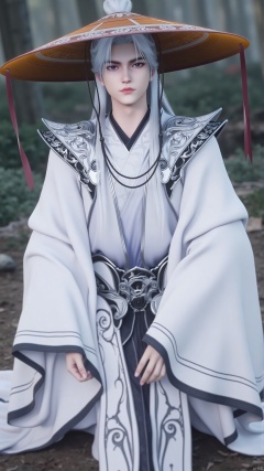 The image is a digital illustration of a young man wearing a traditional Chinese outfit. He is sitting on the ground with his legs crossed and his hands resting on his knees. The outfit is white with intricate black and silver designs on the shoulders and sleeves. The man has long white hair and is wearing a large, wide-brimmed hat with a pom-pom on top. He has a serious expression on his face and is looking directly at the camera. The background is blurred, but it appears to be a wooded area with trees and bushes. The overall mood of the image is peaceful and serene.