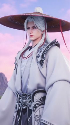 The image is a digital illustration of a young man with white hair and a large hat. He is wearing a traditional Chinese outfit with a white robe and a red necklace. The man is standing in front of a pink and blue sky with a mountain in the background. He has a serious expression on his face and is looking directly at the camera. The hat is large and wide, with a wide brim and a pointed top. The overall style of the outfit is reminiscent of traditional Chinese clothing.