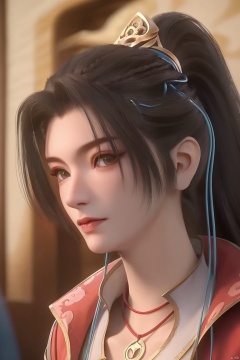 score_9, score_8_up, score_7_up,highly detailed digital,CG,1girl, solo, long hair, looking at viewer, brown hair, black hair, hair ornament, jewelry, closed mouth, jacket, upper body, ponytail,necklace, portrait