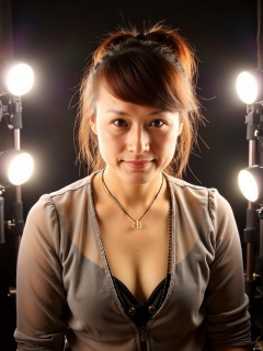 35mm film, one pretty girl, solo, updo, prefect face, makeup, big tits, cleavage, sexy shirt, looking at viewer, bright lights, softbox lighting, upper body, epiCPhoto