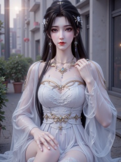 Subject: The subject is a woman with long black hair, wearing a strapless wedding dress with exquisite patterns and decorations, paired with veils, necklaces, earrings and arm decorations of the same style. The overall shape is gorgeous and full of dreaminess.