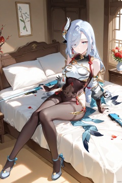 1girl, solo, long hair, breasts, looking at viewer, bangs, blue eyes, hair ornament,shenhe,genshin impact,Armed weapons, indoors, beds, flowers, windows, full-length photos, long legs, high heels, sitting