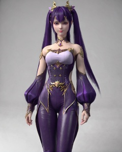 <lora:SF_DaZiYan_Pony_Realism-000004:0.7>,1girl,solo,dress,bangs,purple hair,twintails,leather pants,detached sleeves,hair ornament,standing,looking at viewer,white background,