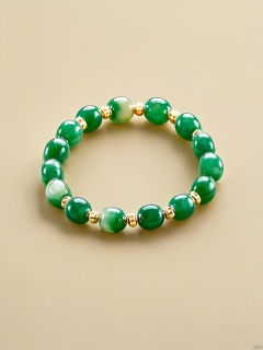 YSCZ, A close-up of a jade bracelet, its surface smooth and polished to a high sheen. The bracelet features a series of interlocking jade rings, each with a subtle variation in color from deep forest green to a lighter, more translucent hue. The background is a muted, sandy beige, allowing the bracelet's vibrant jade tones to stand out against the neutral palette.