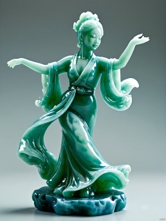 YSCZ, A jade figure of a dancer, twirling gracefully with arms outstretched. The statue's robes and body are carved with fine detail, and the jade's translucent quality gives the figure a sense of fluidity and movement. It sits on a light blue velvet cushion, the color providing a cool contrast to the jade's warm tones. The background is a soft, sky blue, adding a touch of serenity to the image and evoking the sense of open sky and freedom.