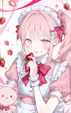 solo, long hair, looking at viewer, blush, smile, bangs, bow, ribbon, holding, upper body, pink hair, short sleeves, hair bow, sidelocks, frills, food, tongue, puffy sleeves, tongue out, pink eyes, side ponytail, puffy short sleeves, wrist cuffs, maid, maid headdress, fruit, stuffed toy, stuffed animal, holding food, pink bow, bandaid, androgynous, 1other, strawberry, bandaid on face, holding fruit, pink theme