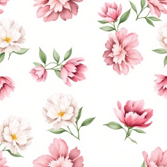 HWTA, A digital painting of a seamless floral pattern featuring large, detailed peonies in shades of pink, white, and red. The flowers are surrounded by lush green leaves, and the background is a clean, white canvas. The style is realistic with a soft, watercolor-like texture. The peonies are arranged in a random, organic manner, creating a visually appealing and balanced composition. The flowers are in various stages of bloom, adding depth and interest to the design. The overall aesthetic is elegant and timeless, suitable for use in decorative prints, wallpaper, or fabric design.