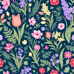 HWTA, A seamless, vibrant botanical pattern featuring a variety of flowers and foliage on a dark blue background. The flowers include pink and red tulips, purple and yellow daffodils, and orange and pink peonies. There are also ferns, lavender, and various other plants. The illustration is done in a whimsical, hand-drawn style with intricate details and rich colors. The pattern is symmetrical and evenly spaced, creating a balanced and harmonious design.