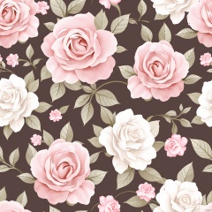 HWTA, A seamless floral pattern featuring large pink roses, smaller white roses, and various green leaves on a dark brown background. The flowers and leaves are illustrated in a realistic style with soft, pastel colors. The roses have a slightly faded look, adding a vintage feel to the design. The pattern is symmetrical and evenly spaced, creating a harmonious and elegant appearance. The overall aesthetic is romantic and classic, suitable for use in textiles, wallpapers, or digital backgrounds.