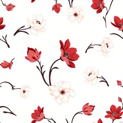 HWTA, A seamless pattern featuring intricate, stylized flowers in various stages of bloom. The flowers are primarily red and white, with intricate detailing of petals and stamens. The background is white, and the flowers are scattered evenly across the image. The style is reminiscent of vintage botanical illustrations, with a combination of smooth and textured elements. The flowers are surrounded by dark, wavy lines that add a dynamic feel to the composition. The overall aesthetic is elegant and sophisticated, with a touch of vintage charm.