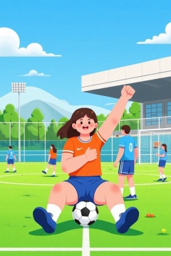 A vibrant illustration of a soccer field with a young girl in an orange jersey and blue shorts sitting on the grass, holding a soccer ball while raising her other hand in a cheerful fist. Other players in blue and orange jerseys play in the background. A fence surrounds the field, with a large white-roofed building nearby. Blue skies, green trees, and distant hills complete the lively scene. Keywords: soccer field, girl, orange jersey, ball, players, fence, building, trees, hills, energy.