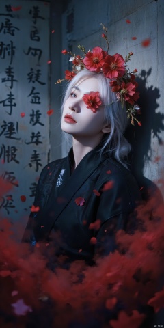 A young Asian woman wearing a flower wreath,An Acrylic style painting that is expressive,gives it a dynamic and emotional quality.a woman with a ethereal red and blue mist surrounding her body. The mist creates a dramatic and surreal effect. A red flower,that is blooming,covering one eye,attached to the face. The woman has a cold aesthetic,complimented by her white hair. Anime art of woman draped in shadows with a lighting that enhances her sexy unique features. with a black kimono adorned with flowers. The background is blurred The background is a wall with Chinese characters written on it creating a stark contrast to the womans outfit. filled with red rose petals.,