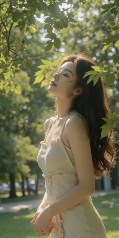 glow,Subject: Fresh and young beauty style,natural lighting,summer freshness scene: outdoor park,shaded by green trees,sunlight filtering through the leaves falling on the body camera angle: standing sideways,head slightly tilted towards the lens,showing a natural expression and posture resolution:4K rendering engine: realistic style,high-definition details,enhanced natural lighting effects aspect ratio: 16:9,