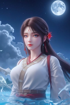 The scene is set against a backdrop of a blue sky, adorned with white stars and a glowing moon. The moon's reflection can be seen in the bottom right corner of the frame, adding depth to the composition.Light blue and white smoke surrounding her.The overall picture features blue and white themes.beautiful detailed water.,yc-hd