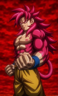 The image depicts a muscular character with vibrant pink hair and a fierce expression, standing against a dramatic red background. The character's body is well-defined, showcasing a strong and powerful physique. The character is wearing a blue wristband and yellow pants, and their fists are clenched, suggesting readiness for action. The overall scene has a dynamic and intense atmosphere, typical of a scene from a fantasy or action genre.