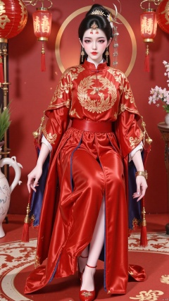 YMJHsqc,1girl,solo,sitting,black hair,updo,hair ornament,hair flower,earrings,red dress,the red dress is adorned with the golden phoenix embroidery,silk texture,long sleeves,wide sleeves,tassel,jewelry,red footwear,indoors,QipaoQ,yunluo,lanterns, Chinese red, Chinese New Year,红兔女郎,Bibidong,W拜年M