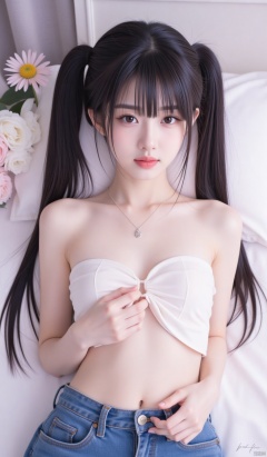1girl, solo, long hair, looking at viewer, black hair,twintails, brown eyes, jewelry, lying, unzipped, open fly,(Navel, the buttons that are unlocked),closed mouth, flower, midriff,indoors, necklace, pillow, strapless, bed,curtains, bandeau,vase, midriff, stomach, jeans, tube top,sleeveless