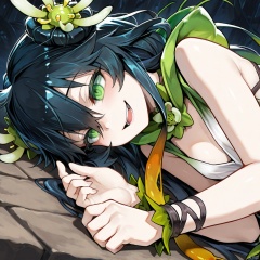 masterpiece, best quality, high quality, Traptrix Vesiculo \(ygo\), 1girl, solo, long hair, smile, open mouth, black hair, hair ornament, sideways, lying, upper body,