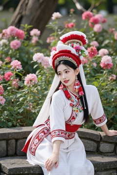 Bai princess,A photograph of a young Asian woman in traditional Bai ethnic costume. She is sitting gracefully on a stone bench in a beautiful garden filled with blooming flowers of various colors. The white princess has a white robe with exquisite red and pink floral embroidery, a red sash, and a white headdress adorned with red and green patterns.