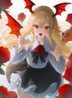 masterpiece,best quality,chromatic aberrationgood work,illustration,depth of field,(color),masterpiece,best quality,good work,illustration,depth of field,cowboy shot,((best quality)),((masterpiece)),ultra-detailed scales,8k,underwater caustics,1girl,solo,long hair,looking at viewer,blush,open mouth,bangs,skirt,blonde hair,simple background,shirt,red eyes,long sleeves,white background,black shirt,flower,frills,wings,pointy ears,fang,collared shirt,black skirt,rose,fangs,bat wings,frilled skirt,head wings,red flower,red rose,petticoat,claw pose,vampire,vampy,Gothic