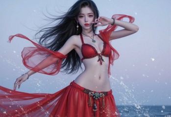 1girl, solo, long hair, breasts, looking at viewer, skirt, black hair, navel, jewelry, standing, earrings, parted lips, sky, midriff, armpits, necklace, red skirt, long skirt, dancing, dancer,water,