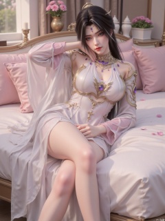 The background is an indoor bed scene, with pink pillows and white sheets on the bed, wooden countertops beside the bed, and containers with pink flowers are placed on it, and some petals are scattered on the ground. The overall environment is warm and romantic, contrasting with the characters. "